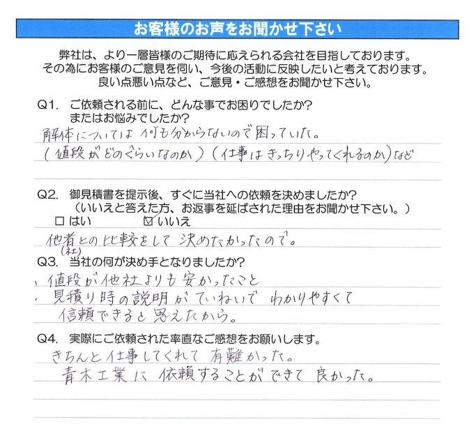 見積り時の説明がていねいでわかりやすくて信頼できると思えたから