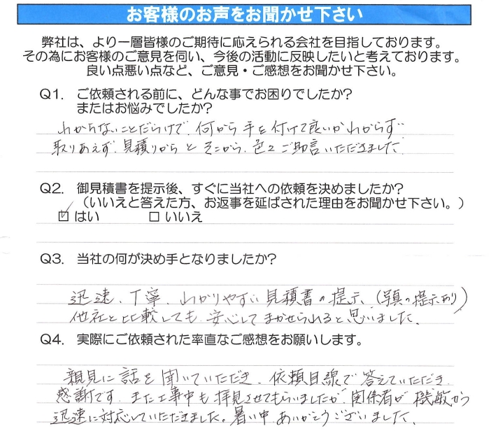 迅速、丁寧、わかりやすい見積書の提示(写真の提示あり)