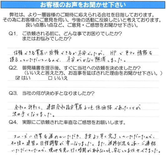 会社の評判と、建設会社指定業者よりも低価格であったことが決め手となりました。