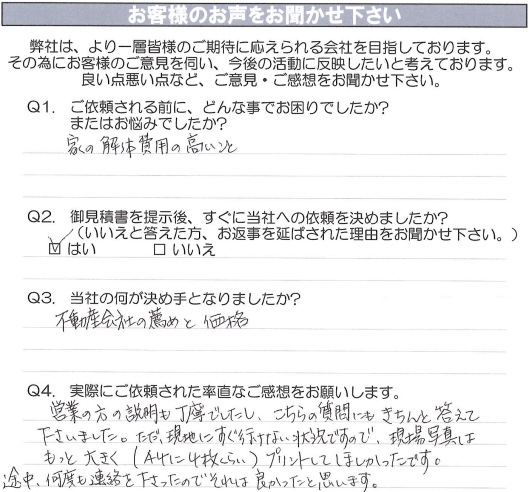 営業の方の説明も丁寧でしたし、こちらの質問にもきちんと答えて下さいました。ただ、現地にすぐ行けない状況ですので、現場写真はもっと大きく(A4に4枚ぐらい)プリントしてほしかったです。途中、何度も連絡を下さったのでそれは良かったと思います。