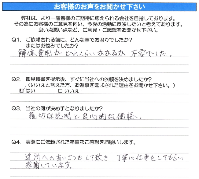 解体費用がどれくらいかかるか不安でした。