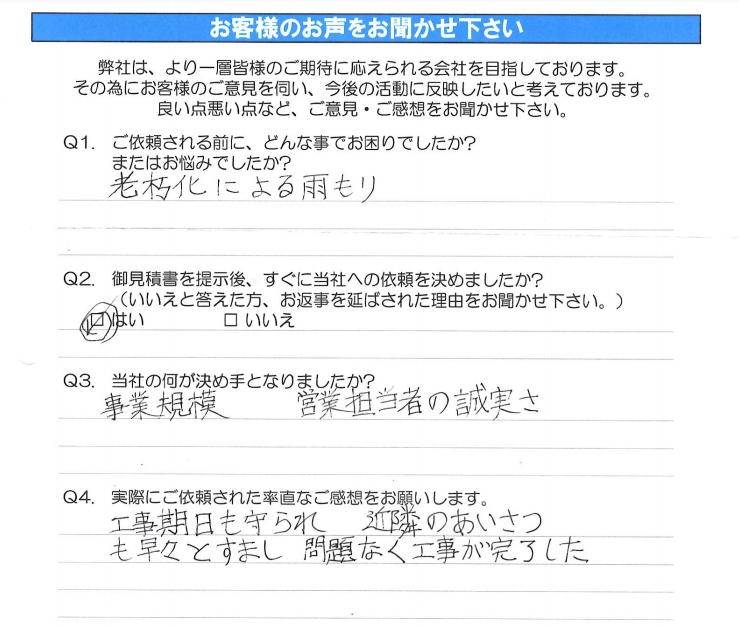 工事期日も守られ、近隣のあいさつも早々とすまし、問題なく工事が完了した。