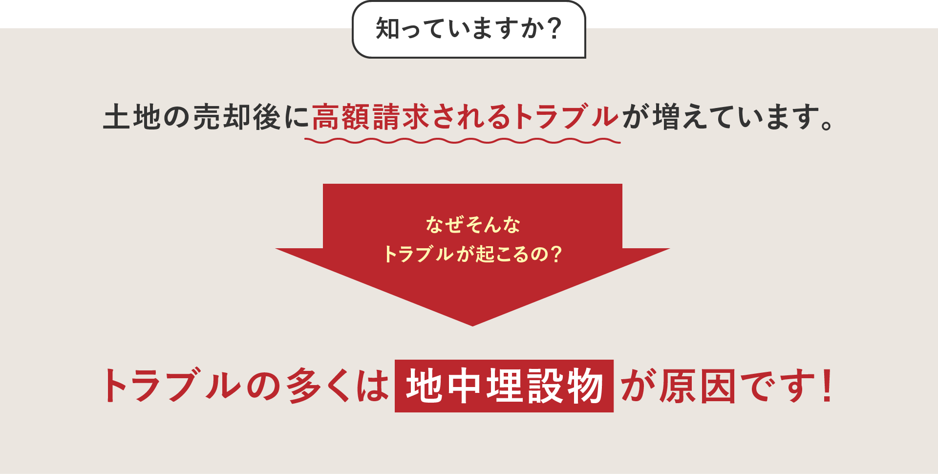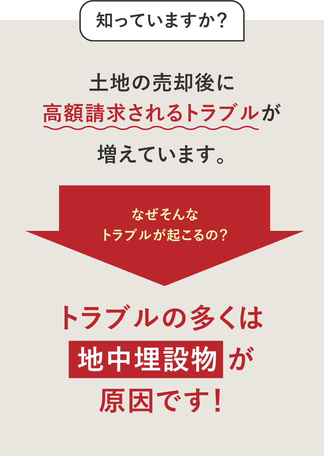 建物解体時に地中埋設物※の確認をしないまま土地を引き渡し、買主の建築時に発覚することがあります。