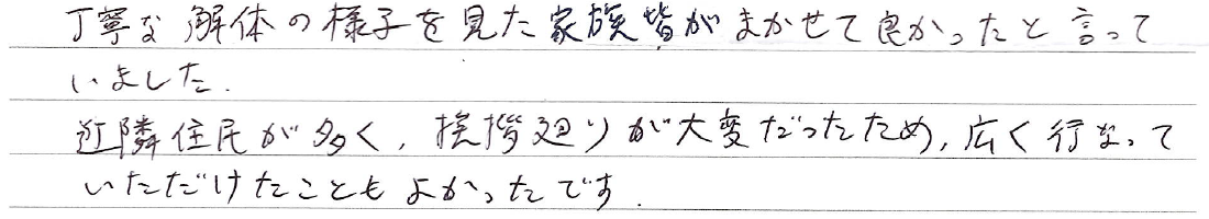 ご家族皆さまに「任せてよかった」と感じていただけたこと、大変うれしく思います。青木工業では、解体時の周辺への配慮を大切にしておりますので、ご安心いただけたことが何よりの励みです。