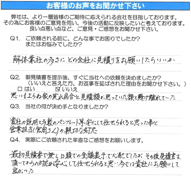その後見積書を頂いてからの対応が安心して任せられると思い
