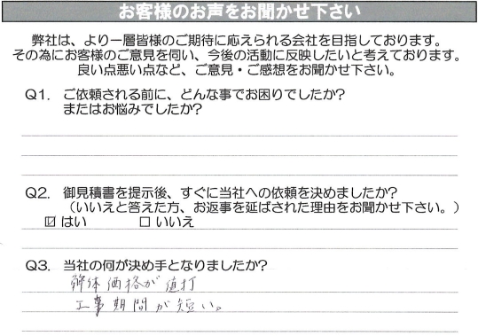 岐阜県各務原市 S・S様の声 解体価格が値打 すぐ依頼されましたか?依頼されなかった方はどんな理由がありましたか? はい 青木工業の何が決め手となってご依頼しましたか? 解体価格が値打 工事期間が短い。 前の記事へ 次の記事へ