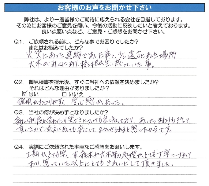 工期がとても早く、雑木や大木等の処理がとても丁寧にされており、