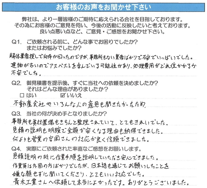 解体業者探しで何件か回ったのですが、事務所もない業者ばかりで不安でいっぱいでした。