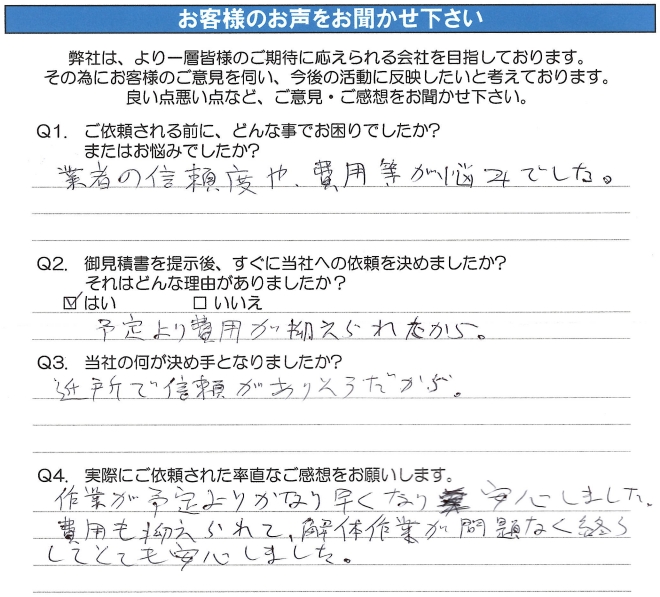 費用も抑えられて、解体作業が問題なく終了して